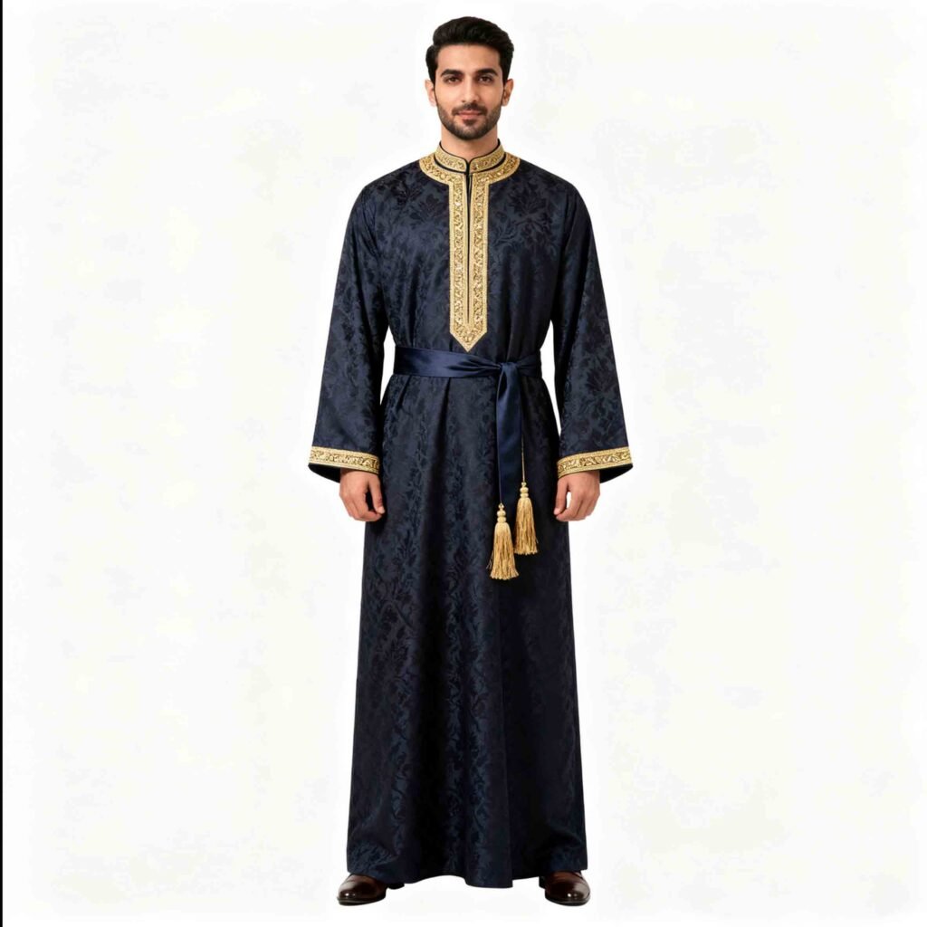 Navy Blue Jacquard Men's Thobe with Gold Trim & Belt Muslim Formal Robe